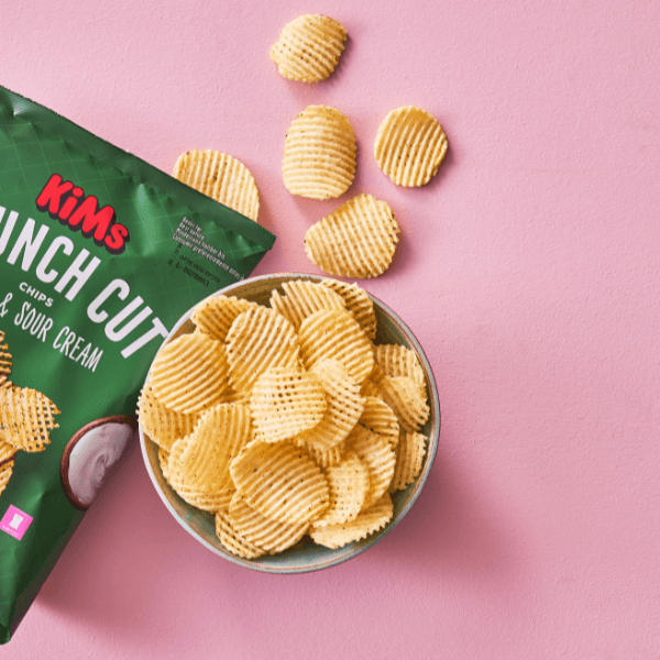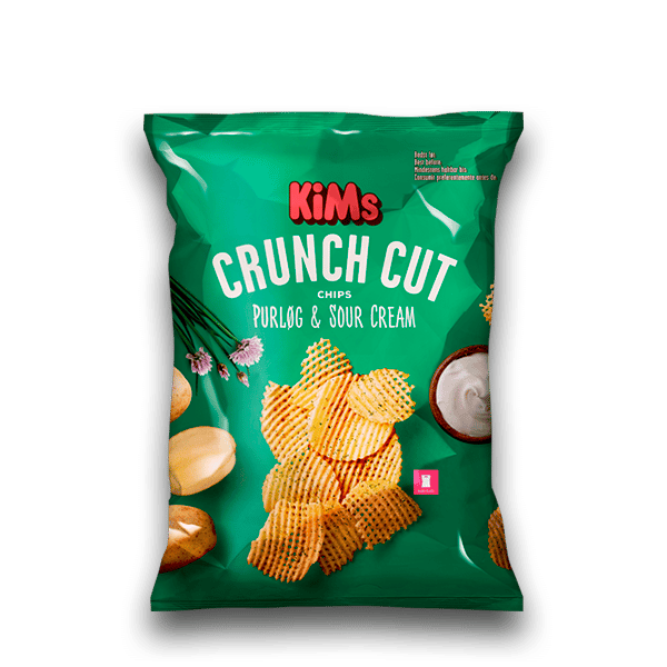 KiMs Crunch Cut Purløg & Sour Cream giver din mund masser af knas og spas med smagsoplevelser, der får dine smagsløg til at smelte. Kartoflerne er blevet snittet både på kryds og tværs, hvor hver lille stribe giver chipsene mere overflade – derfor får du dobbelt op på knas. Med Crunch Cut Purløg & Sour Cream får du den bløde smag af sour cream med et frisk pust af purløg!