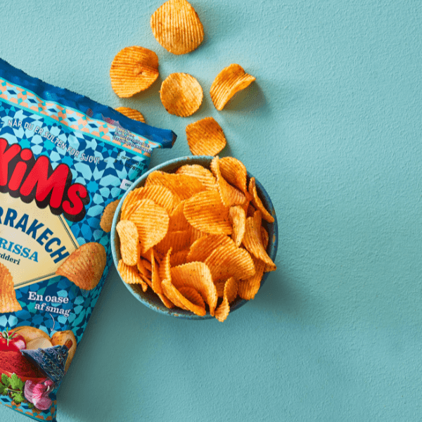 KiMs Marrakech Harissa, en oase af smag. Drømmer du dig også mod varmere himmelstrøg og eksotiske feriesteder? Marrakech Harissa tar’ dig med på en eventyrlig smagsrejse til det marokkanske køkken. En liflig blanding af krydderier, hvor hvidløg, tomat, persille og en anelse chili pirrer dine sanser og får dine smagsløg til at længes efter mere. Det er næsten som at være der selv! Smagen er fra Marokko, men chipsene er made in Søndersø. Dét er hvad vi kalder for en verden af smag!