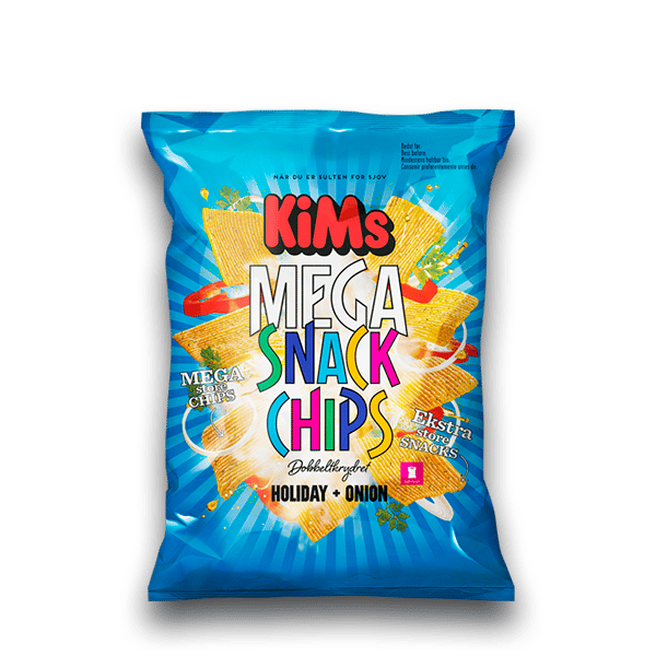 KiMs Mega Snack Holiday & Onion knaser ekstra højt – de er nemlig ekstra sprøde og svøbt i lækre krydderier. Vi har tilføjet riller i hver eneste chips, så smagen har et sted at lægge sig. Sagt mellem rillerne: Del dem med en god ven i larmende godt selskab. Med KiMs Mega Snack Chips får du den samme karakteristiske form – bare 75% større! Sprødt, ik’? Nyd smagskombinationen af sprøde Snack Chips krydret med løg, olie og den velkendte Holiday smag.