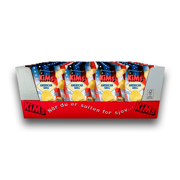 Findes der noget sprødere end KiMs miniposer American Grill 24x25g. Her oplever du den perfekte grillstemning, hvor lækre krydderier blander sig med kødets safter under den sprøde overflades stegestriber? Med KiMs American Grill får du den glødende begejstring af gæstfriheden fra det sydlige USA og den dejlige smag af kartoffel med et røget og fyldigt bid. Chipsene er delikate, sprøde og saftige på én og samme tid. I minipose er de klar til at blive taget med på farten – dét er da knasende sprødt!