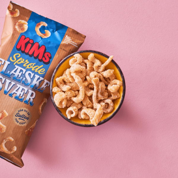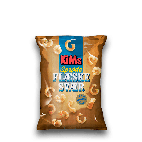 KiMs Sprøde Flæskesvær 45g er svære at holde fingrene fra! Er du klar over, at du smiler, når du holder denne pose i hånden?